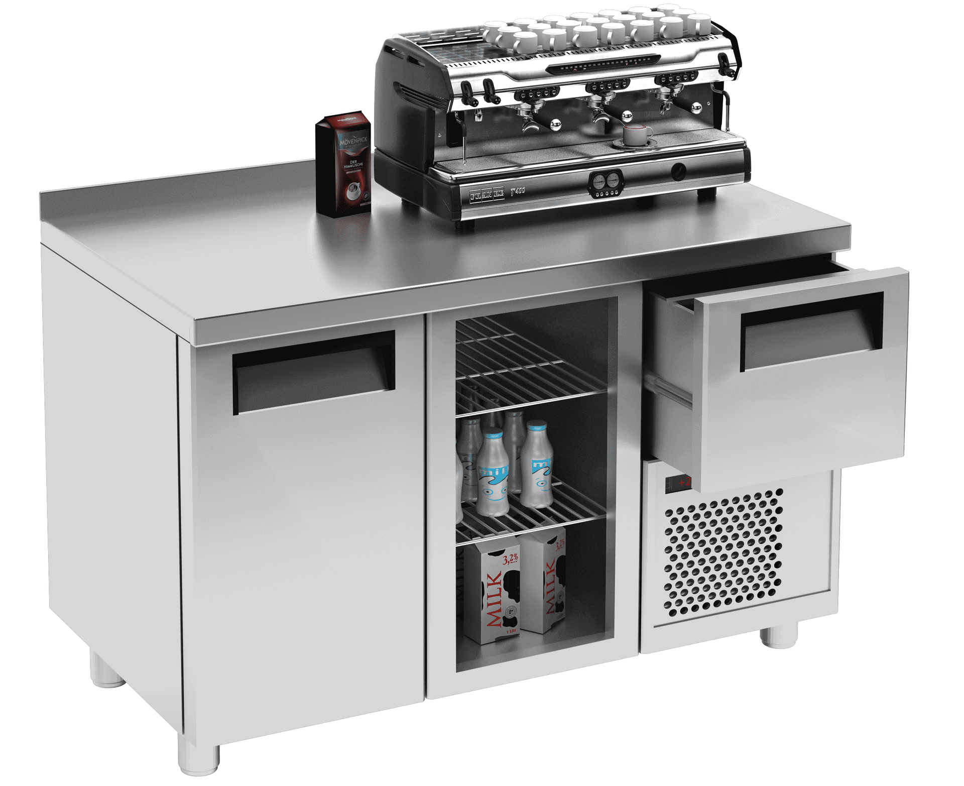 Стол холодильный для кофемашин Carboma T57 M2-1-G 0430-1(2)9 (BAR-250С) предназначен для размещения кофемашин и охлаждения и хранения молока и кофейных зерен на предприятиях общественного питания и торговли. Модель оснащена 4 полками, охлаждаемым ящиком под агрегатом, планкой под выбивание холдера и регулируемыми ножками высотой от 90 до 110 мм. Цельнозаливной корпус выполнен из нержавеющей стали, дверца - из стекла. Возможно исполнение модели с бортом и без борта. Дополнительные характеристики: