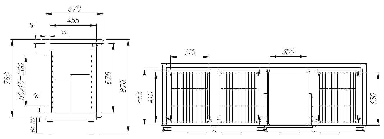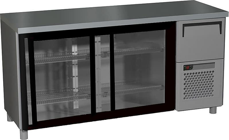 Стол холодильный Carboma T57 M2-1-C 0430 (BAR-360К) предназначен для раскатки теста, обработки ингредиентов для приготовления блюд, охлаждения и кратковременного хранения скоропортящихся продуктов и напитков на предприятиях общественного питания и торговли. Модель оснащена 2 раздвижными дверьми-купе, охлаждаемым ящиком над агрегатом, 4 полками и регулируемыми ножками высотой от 90 до 110 мм. Цельнозаливной корпус выполнен из нержавеющей стали, дверцы - из стекла. Дополнительные характеристики: