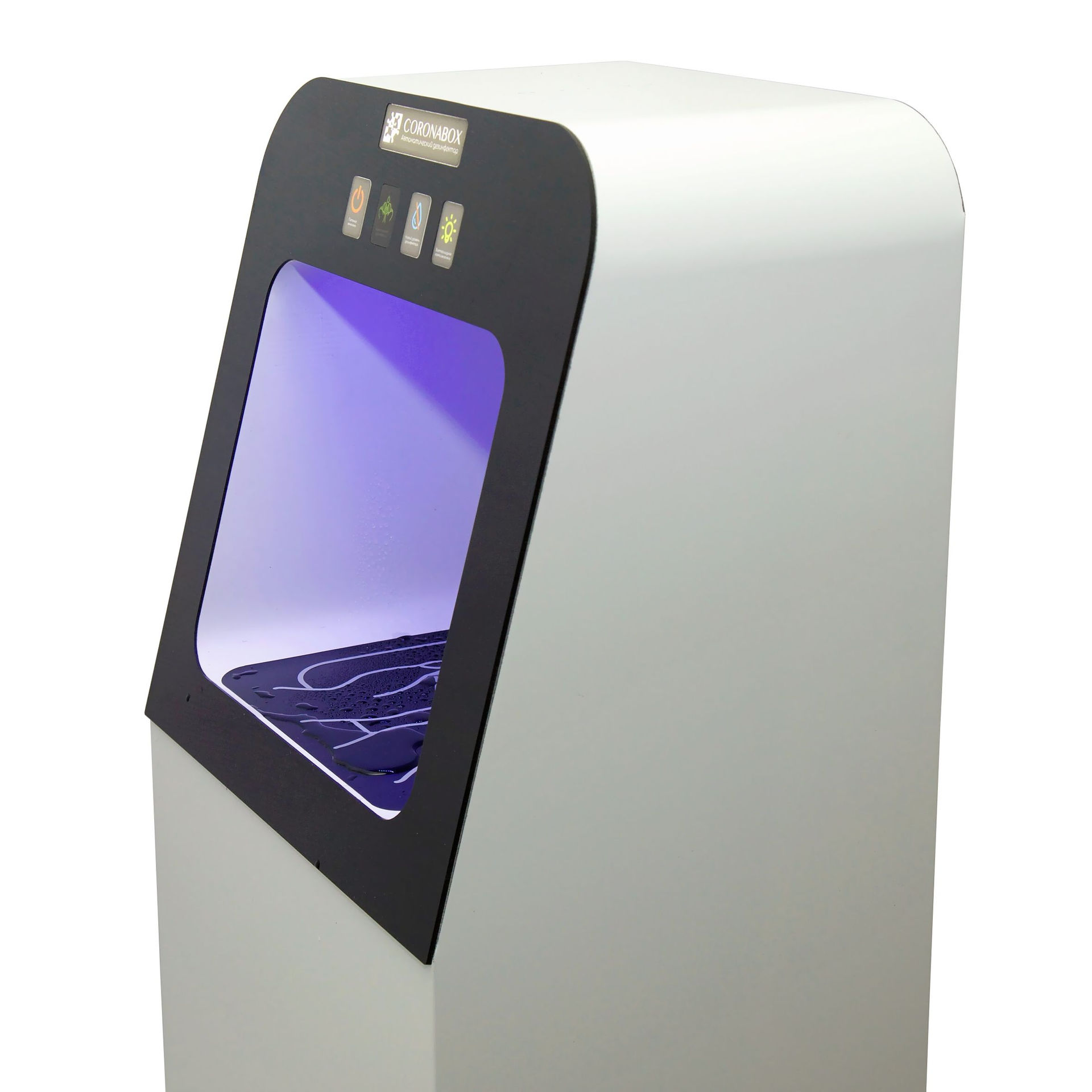 Дезинфектор Coronabox AD-01 бесконтактный напольный для рук применяется для уничтожения любых микроорганизмов на поверхности рук. Устанавливается в любом учреждении, где есть поток людей из улицы в помещение, для предотвращения распространения вирусов. Бесконтактный сенсорный дезинфектор для рук, применяется для уничтожения любых микроорганизмов, включая вирусы, бактерии и грибковые инфекции. Корпус изготовлен из алюминия и пластика, возможны любые цветовые решения. По желанию заказчика устройство адаптируют к фирменному стилю компании, наносится рисунок или логотип. Можно установить экран для демонстрации рекламных или обучающих материалов. Для установки напольного аппарата потребуется не более 1 кв. м. Работает как от сети 220 В, так и от встроенного аккумулятора. Также возможна установка бактерицидной полки для обработки личных вещей (мобильного телефона, ключи, кошелек) UW-лампой.