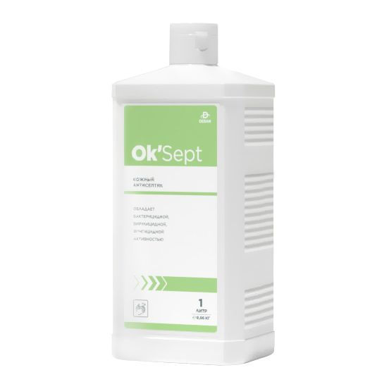 Антисептик кожный для рук спиртовой Ok'Sept обладает пролонгированным антимикробным действием в течение 4 часов. Состав: изопропиловый спирт (2-пропанол) 59%, пропиловый спирт (1-пропанол) 11% и функциональные добавки. Режимы: хирургическая обработка рук — 3 мл х 2 / 1 мин., гигиеническая — 3 мл х 2 / 30 сек.; дезинфекция поверхностей 15 мин. при любых инфекциях. Норма расхода средства 30 мл/м2.