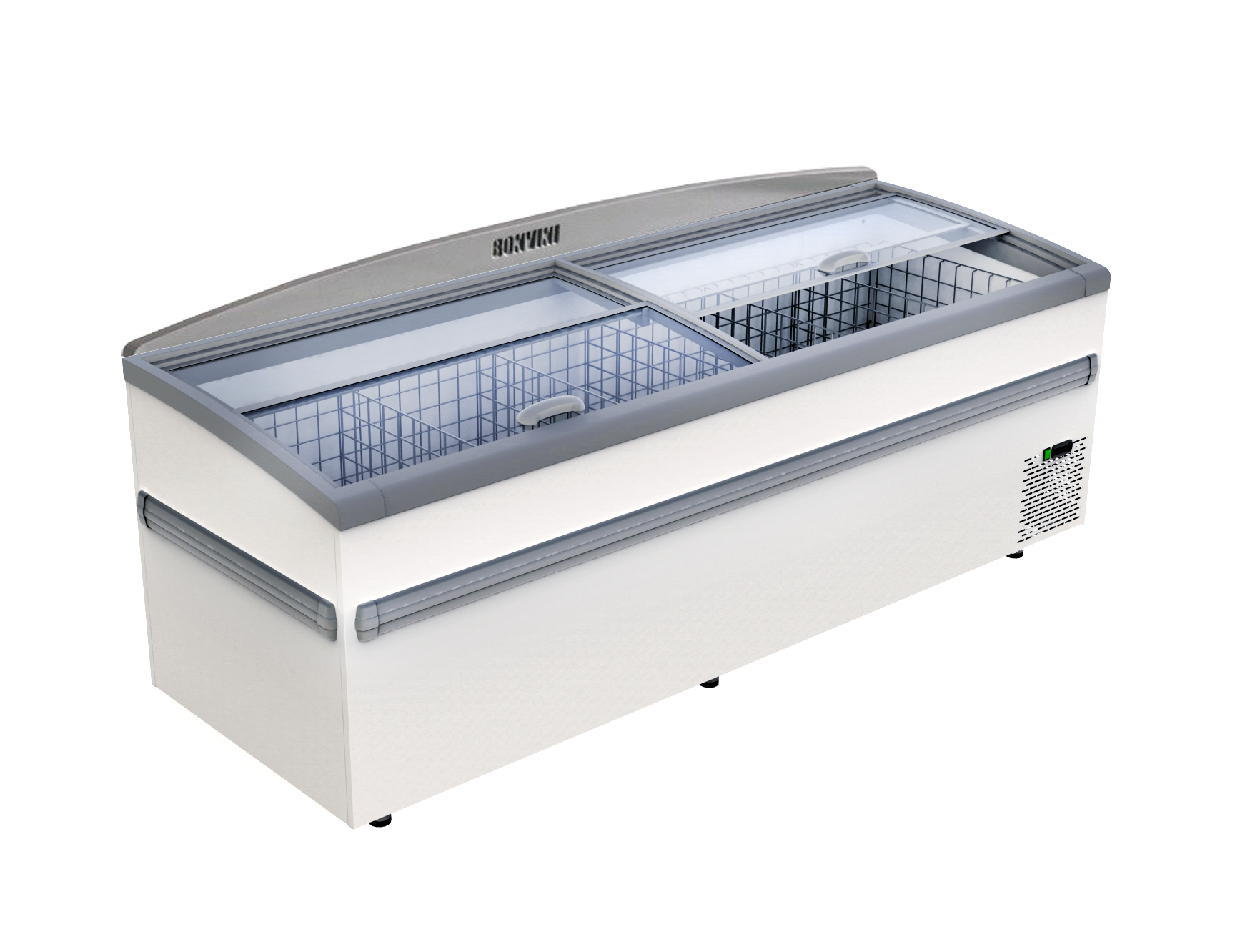 Морозильный ларь-бонета BONVINI BFG 1850Т РН с гнутыми стеклами Push UP, предназначен для хранения и демонстрации ранее замороженных продуктов. Специальное гнутое стекло обеспечивает хороший обзор хранимых внутри камеры товаров. Особенности открывания дверей поперечные, а не продольные, в отличие от типовых моделей имеющихся на рынке. Пластиковый декоративный элемент с логотипом, позволяет зонировать торец от прямых бонет и эстетически определяет и поддерживает островную группу. Конструкция стекол Puch UP, обеспечивает, как удобство покупателям (одновременное открывание стекол), так и владельцам оборудования, обеспечивая поддержание нужного температурного режима за счет открывания стекол на половину размера бонеты. В бонете BONVINI BFG 1850Т РН установлена сбалансированная холодильная система. Бонеты BONVINI BFG 1850Т РН также могут работать, как в морозильном, так и в холодильном режиме.Оборудование комплектуется сетчатыми полками или корзинами, энергосберегающей светодиодной подсветкой, а также удобными врезными и эргономичными ручками, устойчивыми металлическими ножками, по желанию может комплектоваться колесами.