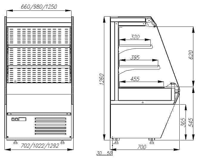 Горка холодильная Carboma F 13-07 VM 1,3-2 (1260/700 ВХСп-1,3) (стеклопакет) используется на предприятиях общественного питания и торговли для охлаждения, кратковременного хранения, демонстрации и продажи напитков, мяса, птицы, колбасных, молочных и гастрономических изделий. Модель оснащена стеклопакетом, вмонтированным в боковые панели для лучшего обзора продукции, 2-мя полками c возможностью расположения под углом и изменения высоты, ночной алюминиевой шторкой и регулируемыми ножками высотой от 30 до 50 мм. Корпус выполнен из оцинкованной стали с ППУ изоляцией, внешние обшивки и полки из стали с полимерным покрытием серебристого цвета, боковины - из полистирола. Дополнительные характеристики: