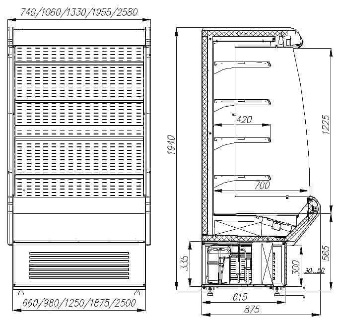 Горка холодильная Carboma F 20-08 VM 0,7-2 (ВХСп-0,7) используется на предприятиях общественного питания и торговли для охлаждения, кратковременного хранения, демонстрации и продажи напитков, мяса, птицы, колбасных, молочных и гастрономических изделий. Модель оснащена панорамным боковым остеклением, 4-мя полками c возможностью расположения под углом и изменения высоты, ночной шторкой и регулируемыми ножками высотой от 30 до 50 мм. Корпус выполнен из оцинкованной стали с ППУ изоляцией, внешние обшивки и полки из стали с полимерным покрытием серебристого цвета, боковины - из пластика. Дополнительные характеристики: