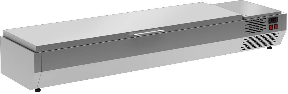 УСТАНОВКА витрины SM:Оборудование может быть установлено на борта специальных столов для приготовления пиццы, а так же может использоваться, как самостоятельное изделие, и снабжено регулируемыми ножками-опорами. По конструктивному исполнению витрина холодильная состоит из теплоизолированного корпуса со встроенным холодильным модулем. Крышка над холодильным агрегатом выполнена в виде горизонтальной площадки и выполняет роль столешницы для сопутствующих и вспомогательных предметов. Испаритель расположен внутри ванны для гастроёмкостей. В ванне имеется отверстие для слива конденсата, который попадает в специальную ёмкость с выпаривателем в машинном отделении.
