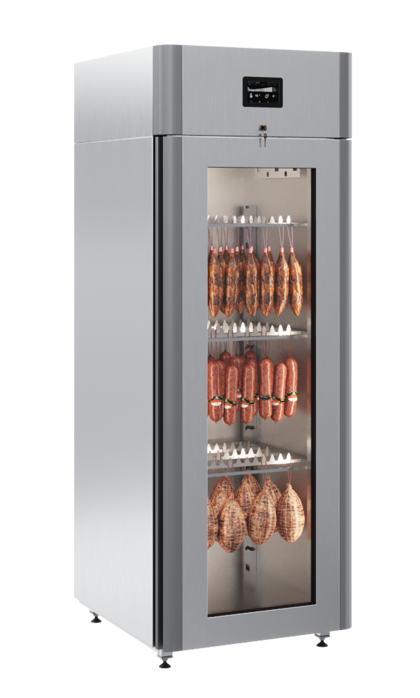Холодильная система с деликатным обдувом содержимого, ультразвуковой увлажнитель, датчик влажности, электронный контроллер с возможностью управлять работой шкафа, создавать и сохранять собственные программы, UV-лампа, три пары направляющих с подвесами для колбас и мясных деликатесов, педаль открывания двери входят в комплект стандартной поставки шкафов. Стеклопакет двери обеспечивает визуальный контроль всех процессов.