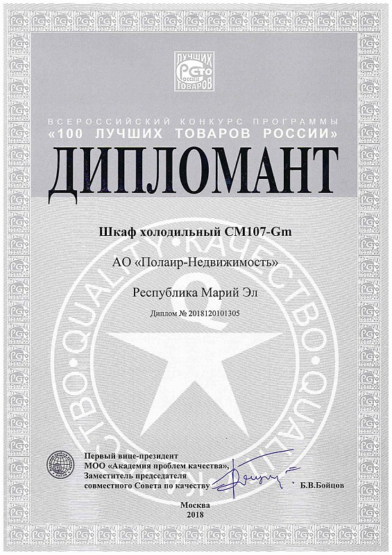 Звание ДИПЛОМАНТА с правом использования серебряного логотипа «100 лучших товаров России» получил Шкаф холодильный POLAIR - СМ107-Gm.